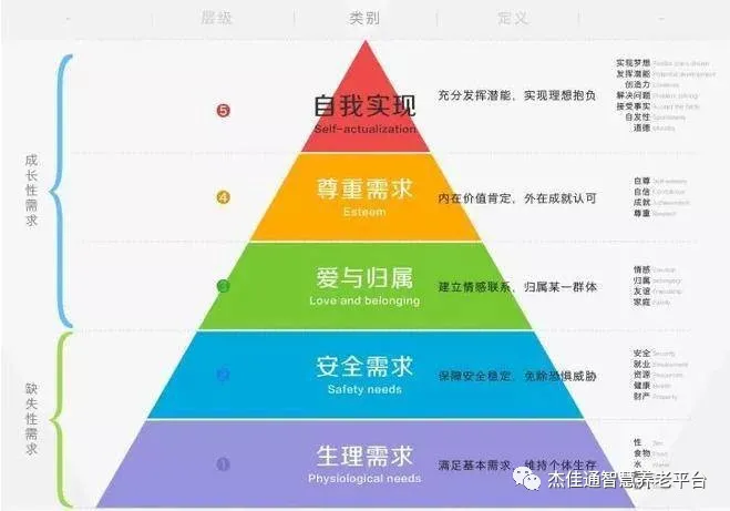 健康老人和失能老人的需求其實(shí)有很大差異,主人公的需求包括健康監(jiān)控報(bào)警、送餐服務(wù)、保潔服務(wù)、社交需求、陪伴需求等等,而老王的需求主要是護(hù)理需求。這些需求按照馬斯洛分層理論可以分為生理、安全、情感、尊重和自我實(shí)現(xiàn),其中生理和安全需求為缺失性需求,情感、尊重和自我實(shí)現(xiàn)為成長(zhǎng)性需求。