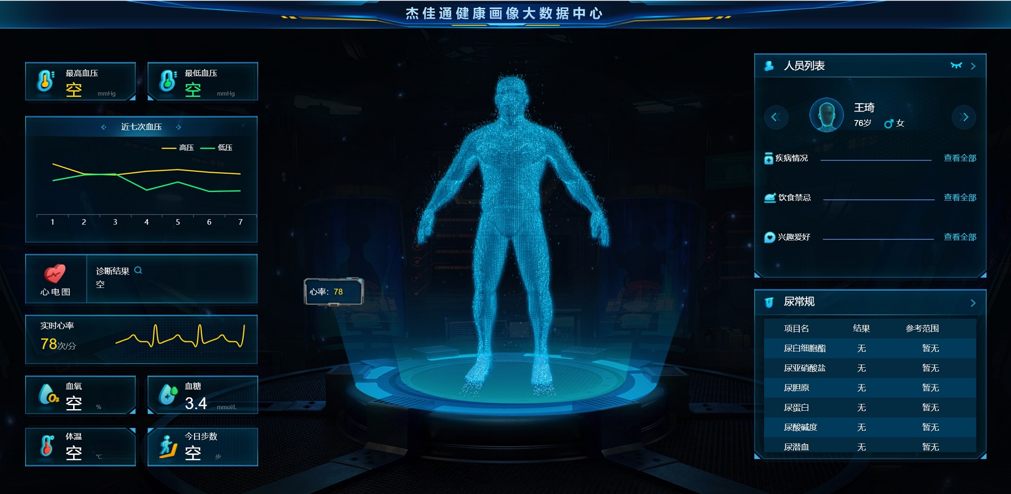 杰佳通智慧養(yǎng)老平臺遠(yuǎn)程健康監(jiān)控系統(tǒng)(簡稱JJT-RHM System, JJT- Remote Health Monitoring System),是本著“遠(yuǎn)程監(jiān)控—健康檔案—健康預(yù)警—健康促進(jìn)”的思路設(shè)計(jì)的。遠(yuǎn)程自動(dòng)對老人各項(xiàng)醫(yī)療測量指標(biāo)(血壓、血糖、血壓、心電、體重、脂肪、睡眠、計(jì)步等等)的監(jiān)測,及時(shí)發(fā)現(xiàn)異常并通知本人或子女,可以供老人就醫(yī)的醫(yī)院參考,子女和醫(yī)生可以通過APP實(shí)時(shí)查詢。