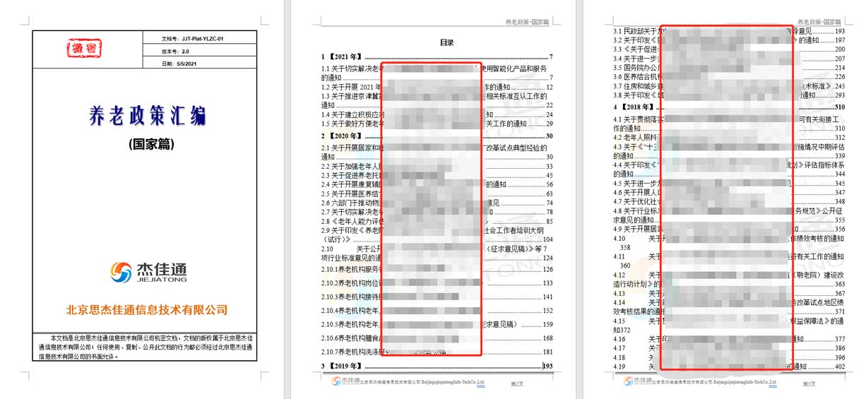 杰佳通在16年的智慧養(yǎng)老研發(fā)和建設(shè)中,不斷總結(jié):如何讓養(yǎng)老運營單位少走彎路,快速實現(xiàn)盈利,除不斷完善《養(yǎng)老運營匯編》一書外,近期也編制了《養(yǎng)老政策匯編》系列書,分為國家篇和地方政府篇,其中國家篇一書,總頁數(shù)為八百多頁,供我們的合作伙伴參考。